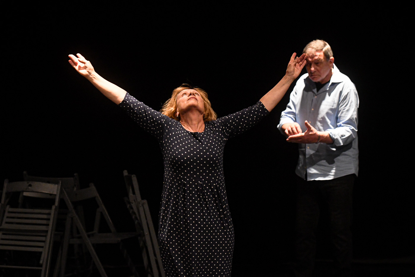 Autorská inscenace Stand Up (and Try to Stay Standing) je něčím mezi storytellingem, stand-upem, fyzickým divadlem a postmoderním kabaretem. Hlavní roli v ní hrají příběhy skupiny seniorních herců, kteří inscenaci společně s tvůrčím týmem divadla připravili. Příběhy, které během představení zazní jsou osobní, vysněné, odžité, vymyšlené, reálné i fiktivní.